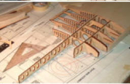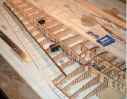 You start building the wing by gluing plywood reinforcements to the appropriate ribs and premounting the flap and aileron servos. Sockethead screws and access covers permit removal for service. |